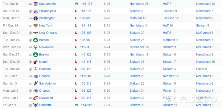 2025年12月9日击败国王后卡莱尔就拿到999胜,结果步行者吞下了一波13连败,这是步行者队史最长的连败,大家可以看到这一波13连败有5场分差只有8分左右,甚至有三场分差只有2分,说明步行者在决胜时刻就有意放水输球。